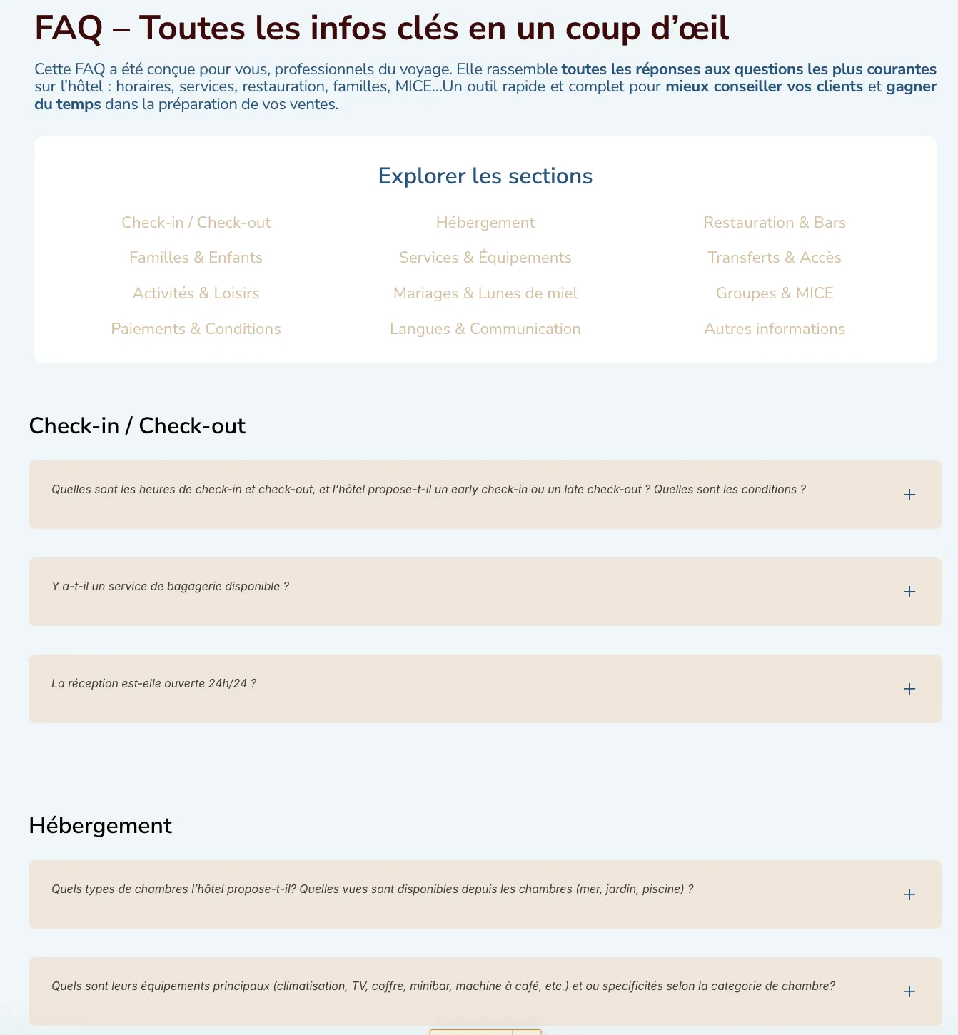 Enrichie chaque jour par nos hôtels partenaires et notre équipe, la plateforme centralise et structure l’ensemble des informations hôtelières essentielles.